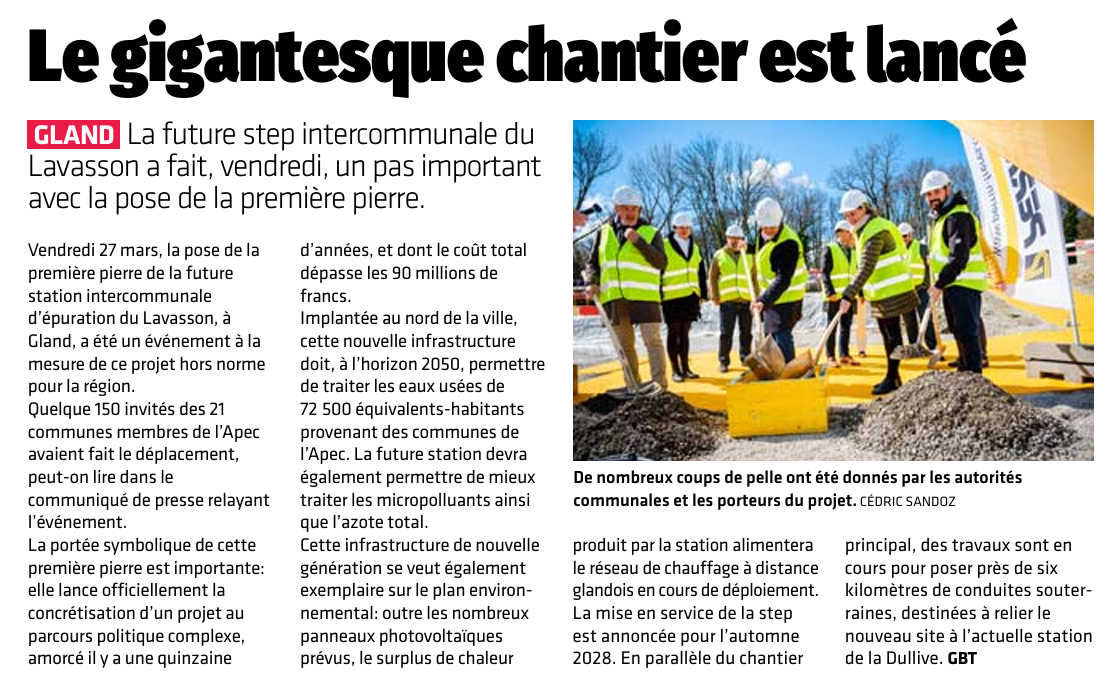 Le Quotidien La Côte consacre un nouvel article au projet de step-apec Lavasson, cette fois-ci en se penchant sur le chantier et l'impact que celui-ci aura sur la population.