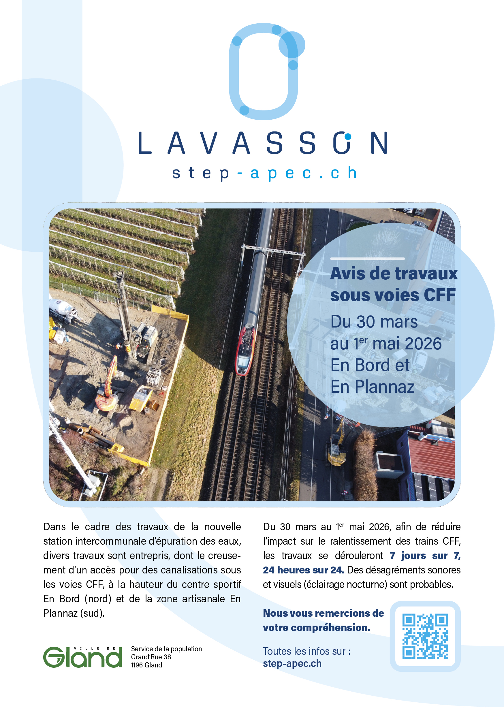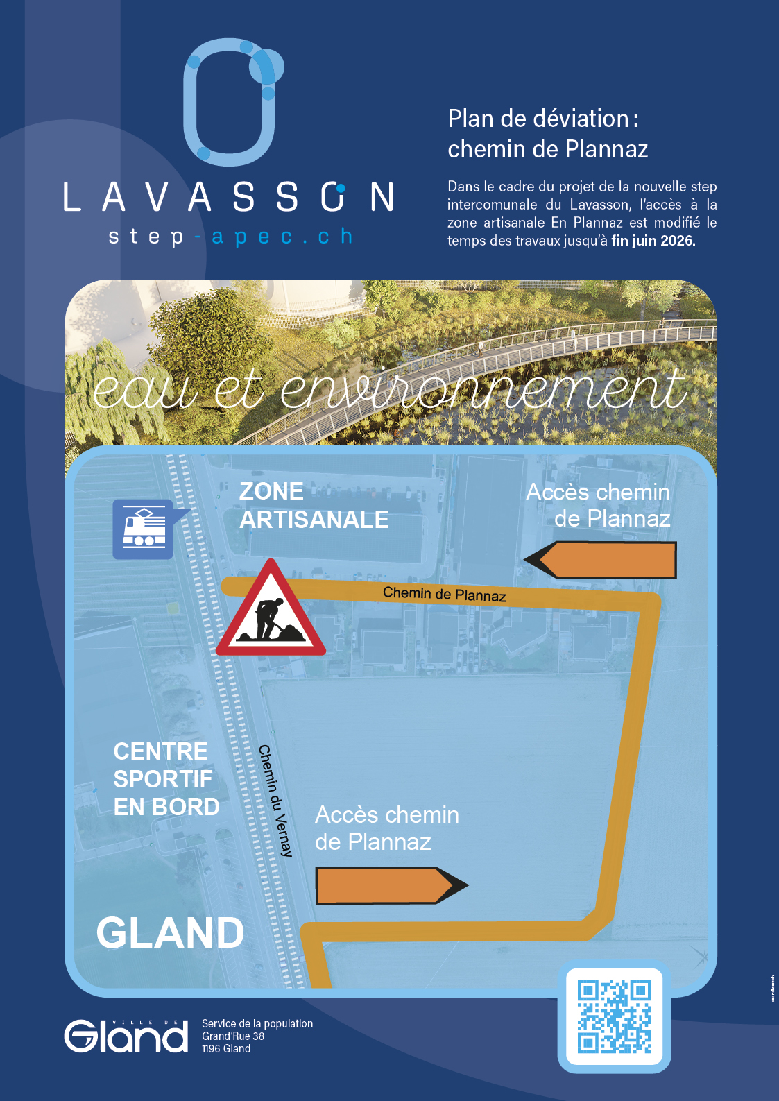Dans le cadre des travaux de construction de la nouvelle step intercommunale, au Lavasson, une déviation est mise en place au chemin du Vernay, au sud des voies CFF, pour accéder à la zone artisanale En Plannaz. Cette déviation durera jusqu’au mois de juin pour permettre à un micro-tunnelier de creuser sous les voies CFF, afin de relier différentes canalisations de la nouvelle step du Lavasson, au nord de Gland, à celles de la Dullive, au sud.